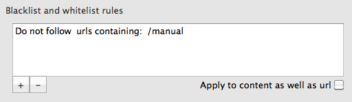 You can ask Integrity to list but not check certain links, to ignore certain links completely, or not to follow certain links. You do this by setting up a rule and typing part of a url into the relevant box. For example, if you want to only check the section of your site below /engineering you would choose 'Only follow...' and type '/engineering' (without quotes). You don't need to know about pattern matching such as regex or wildcards, just type a part of the url. Separate multiple keywords or phrases with commas.