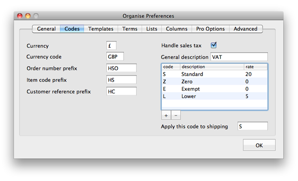 When you first start Organise v6, it will set up the following codes for you, based on current UK law.
