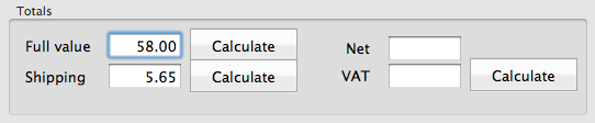 Organise can calculate the total value of the goods or services from the previous tab if you press the first Calculate button. If you wish to calculate shipping from the list of Items on the Items Purchased table, press the button beside the shipping field. This can be overtyped or entered manually.