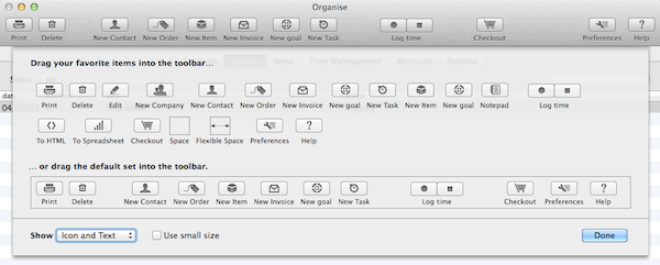 Organise has a quite a number of toolbar buttons, not all of them show by default, but you can add or remove buttons and change the order. This is all standard OSX functionality.