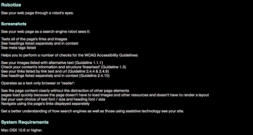 - Helps you to perform a number of checks for the WCAG Accessibility Guidelines: