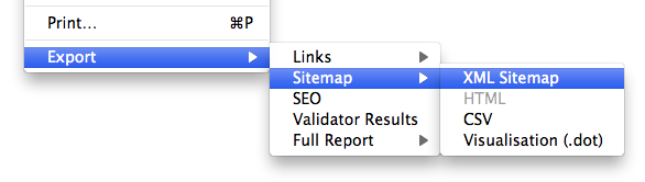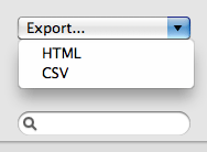 All tables can be exported as csv just as you are viewing them. Some views have more specialised exports such as the xml and html sitemap.